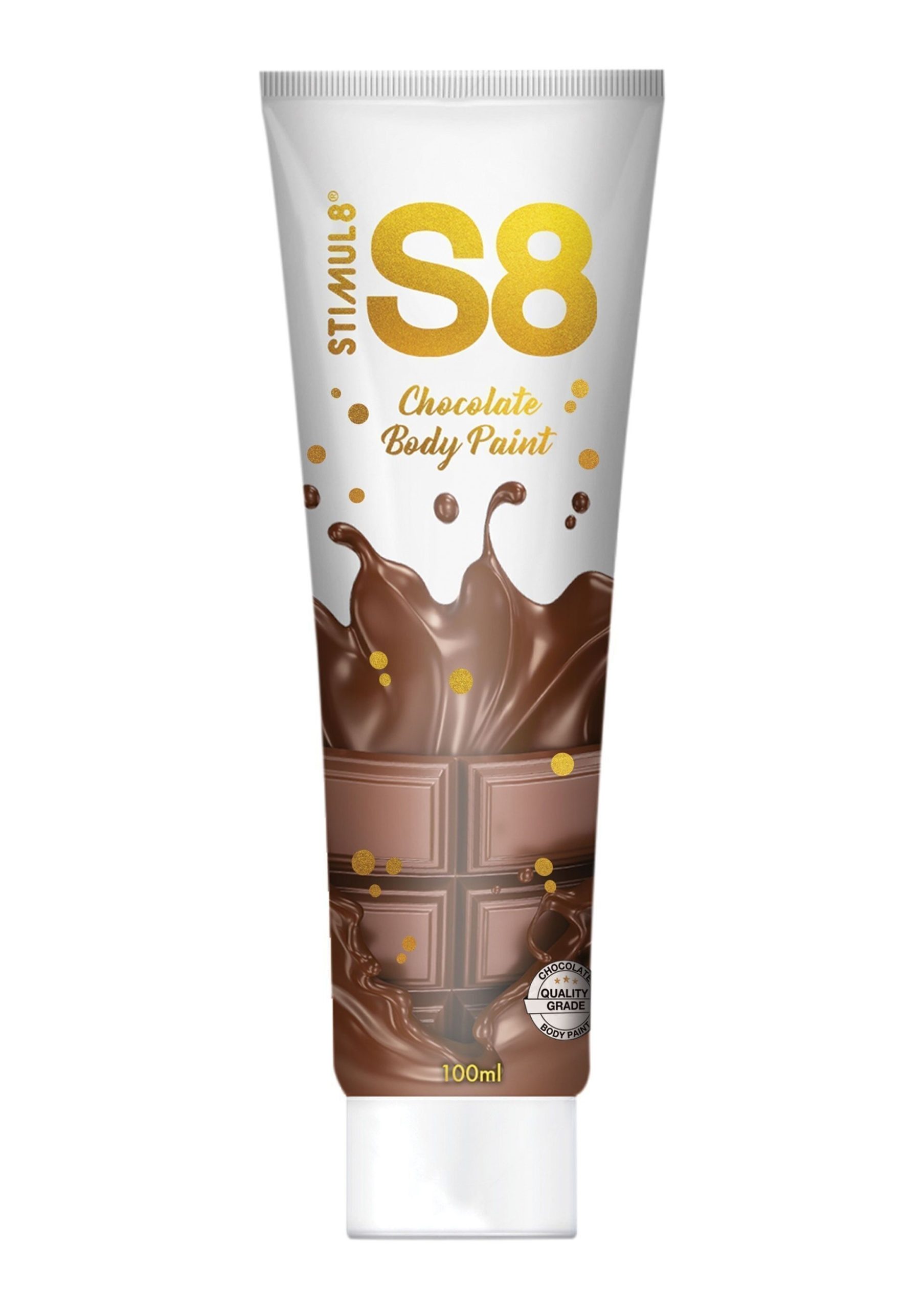Il bodypaint S8 al gusto di cioccolato viene fornito in un tubo pratico e facile da usare ed è composto al 100% da ingredienti commestibili e sicuri per il corpo.