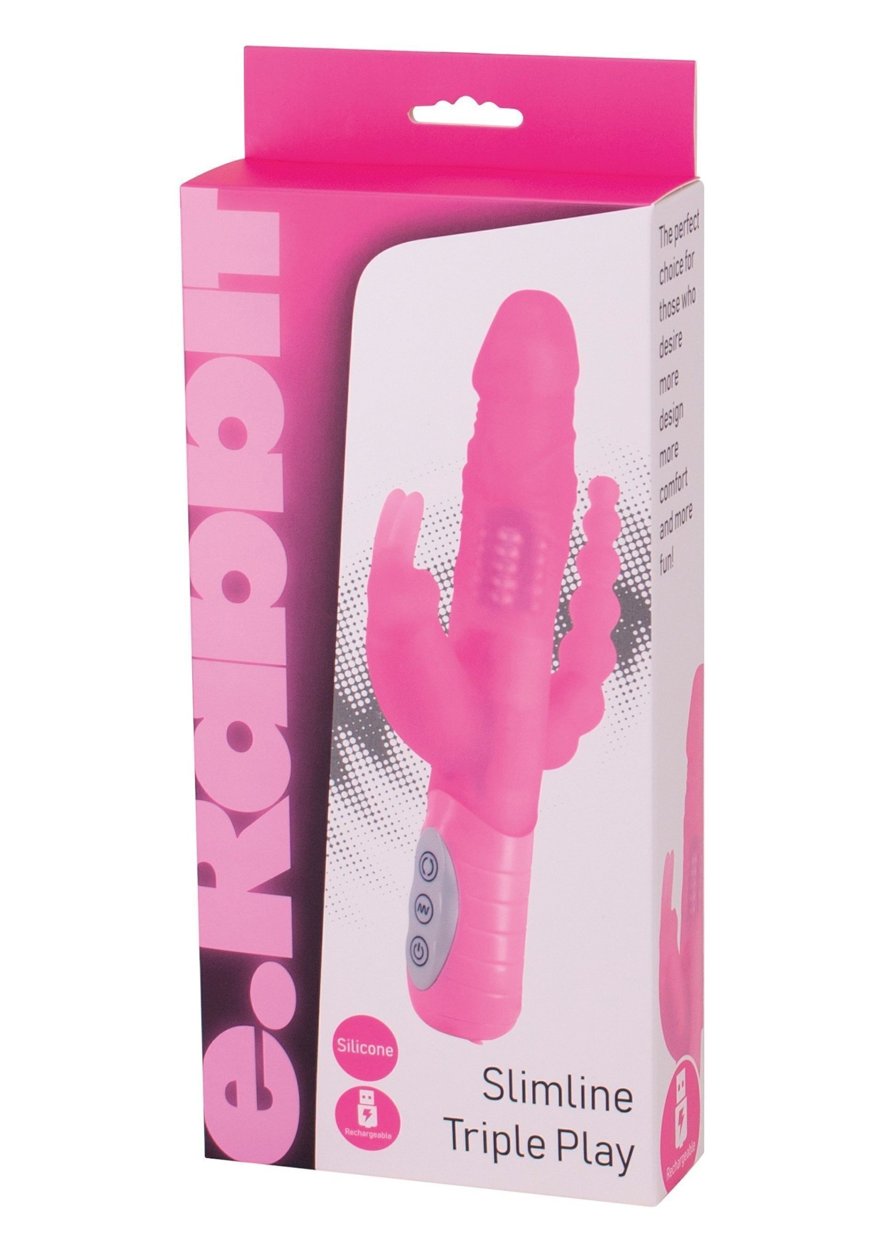 Goditi il piacere simultaneo a 3 vie del tuo eRabbit Triple Play! Stimolando il clitoride, la vagina e l’ano allo stesso tempo. È il giocattolo perfetto per la donna che vuole tutto! Combinando il movimento interno, la stimolazione del punto G, un classico stimolatore del clitoride di coniglio e un set di palline anali in un unico coniglio ricco di funzionalità. La punta curva e leggermente affusolata al fine di rendere facile l’inserimento del punto G. Appena oltre la punta e lungo l’asta c’è una serie di perline interne che ruotano, massaggiando delicatamente le pareti interne con una sensazione unica. Nella parte anteriore, un classico solletico clitoride fa la sua magia. Sul retro, un set graduato di palline anali. Controllare l’azione del tuo eRabbit Triple Play è facile grazie alla sua interfaccia a 3 pulsanti. Con 7 funzioni sincronizzate da esplorare. Porta il tuo eRabbit con te ovunque tu vada grazie alla sua ricarica completamente USB.